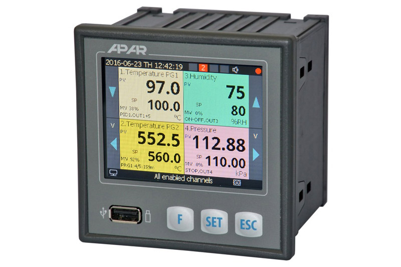 Control algorithms: ON-OFF with hysteresis, PID, PID autotuning, 6 segments process controller with timer